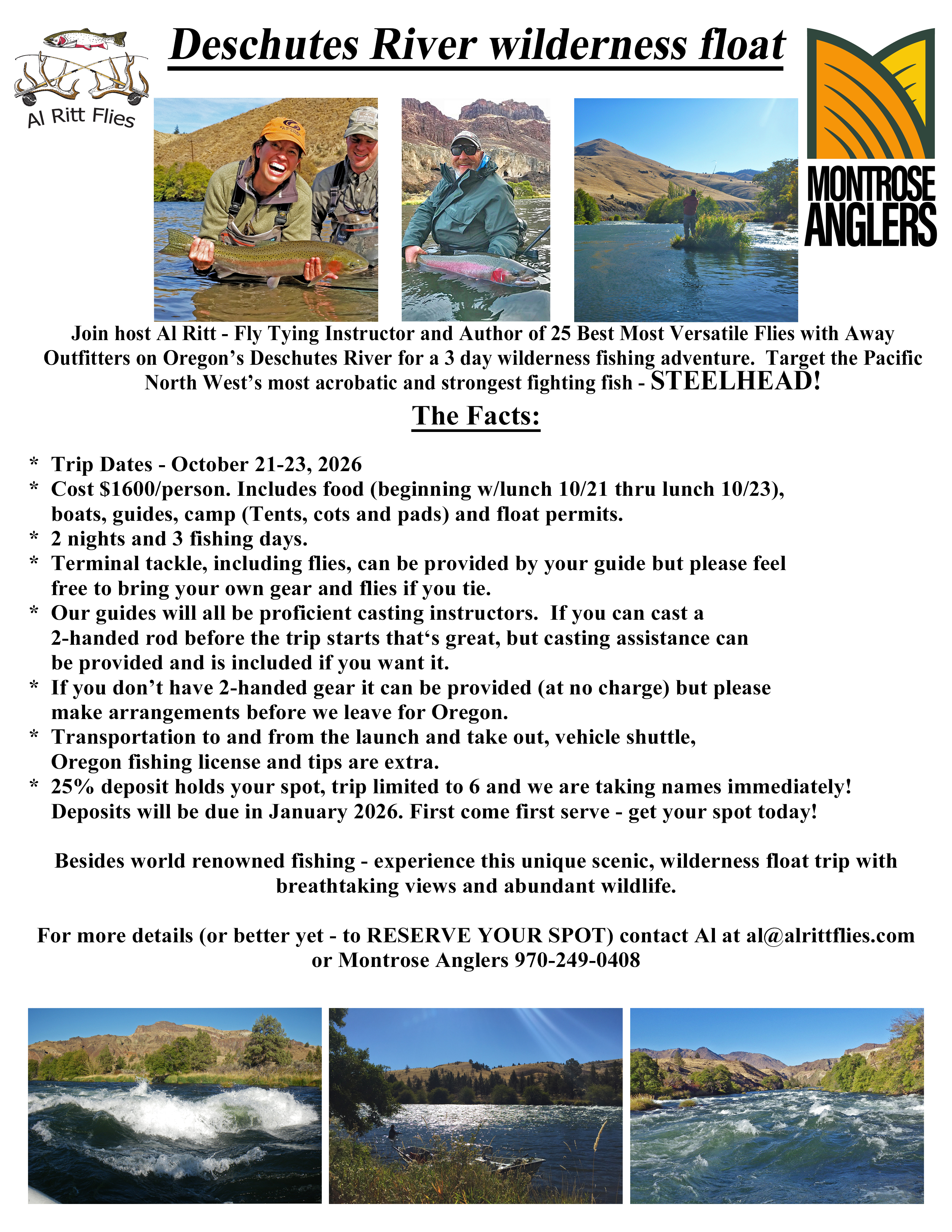 - Deschutes River - Steelhead. This is a 3 day float and camp trip on a very difficult to access stretch of a legendary western river. Lots of great scenery, wildlife and very little company on the river. There is also a very healthy bonus population of robust, hard-fighting redband rainbow trout.