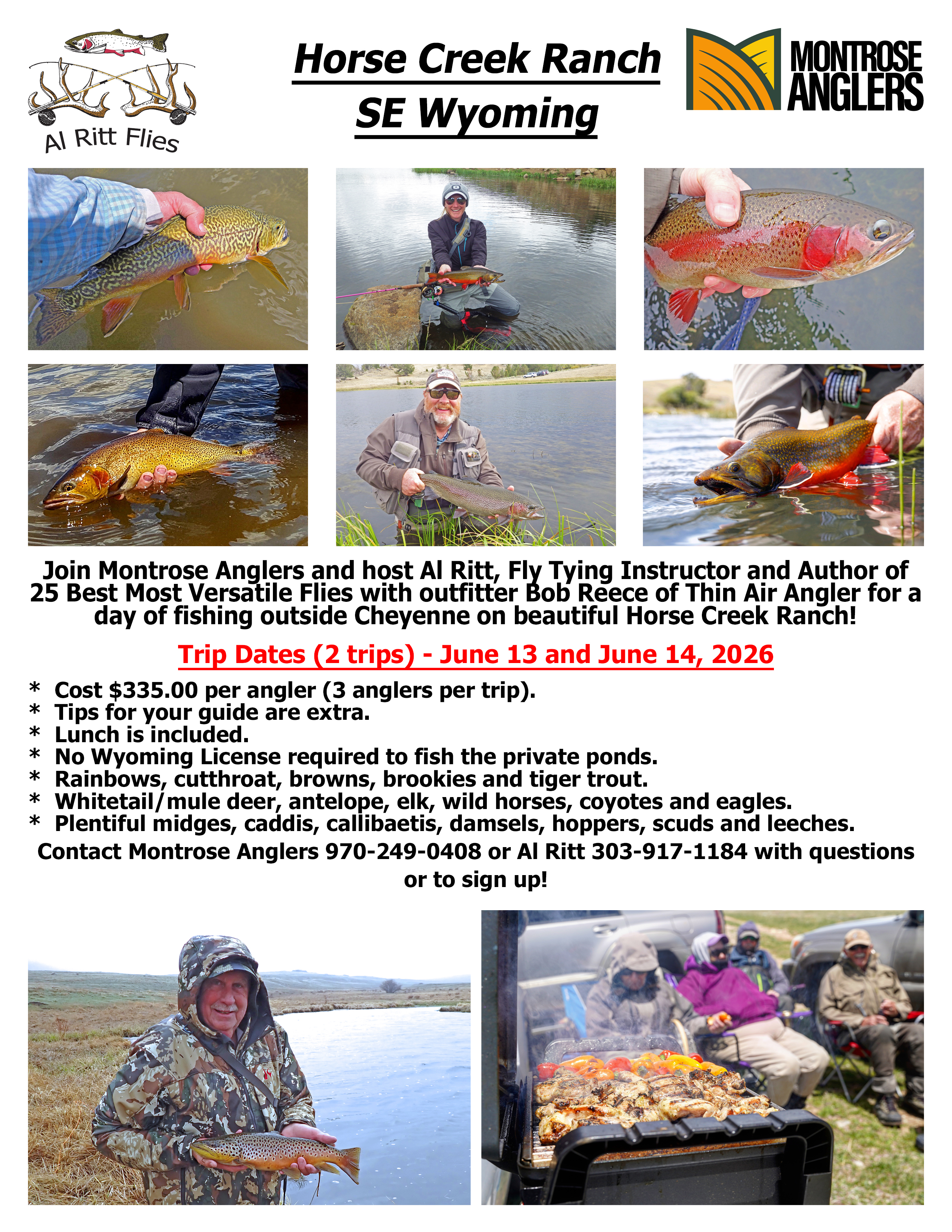 - Horse Creek Ranch - SE Wyoming private water with rainbow, cutthroat, cut-bow, brown, brook and tiger trout. This is traditionally a trip that is very popular and fills very quickly. Unfortunately it is currently full for 2026, but we will take names for a cancellation list.