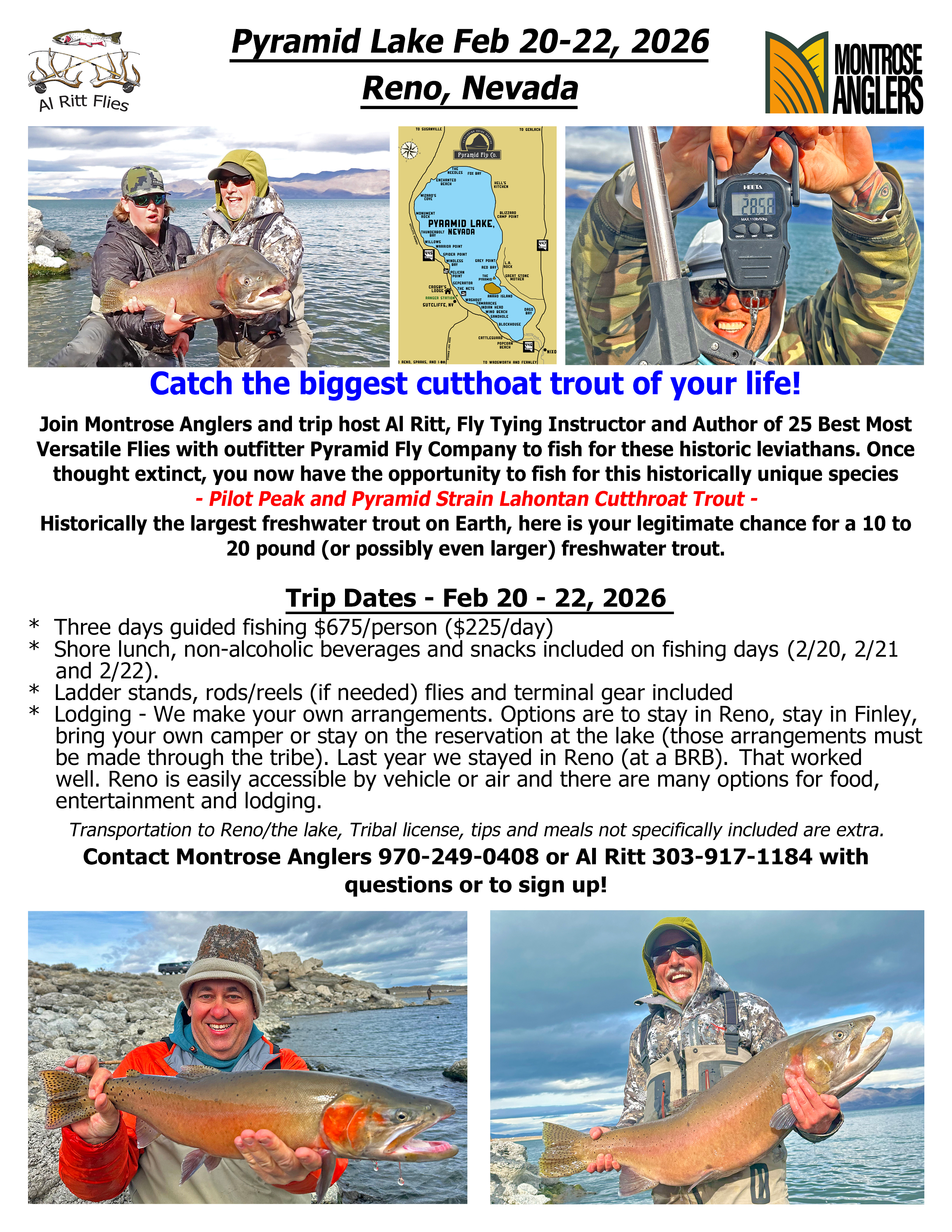 - Pyramid Lake - Lahontan cutthroat trout. This trip is in late February outside Reno, Nevada and you will target a unique train of enormous cutthroat trout (10 pound fish are not uncommon and in 2025 2 fish over 20 pounds were landed by Al's group). Trip includes 3 fishing days and is a great destination if you want to experience more of what Reno has to offer or want to travel with a non-fishing partner.